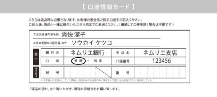商品と、口座情報カードまたは口座情報を記入した用紙を一緒に梱包してください